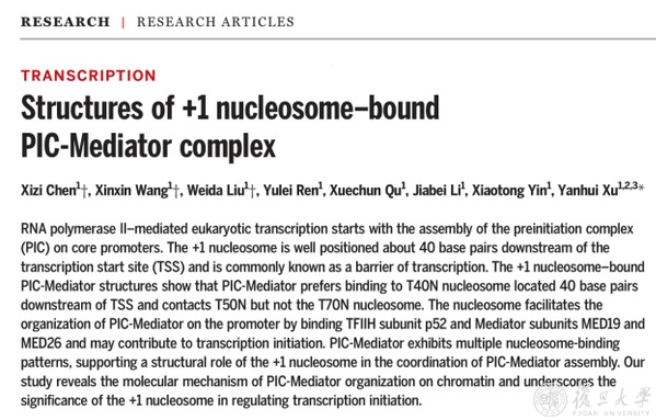 2022年10月7日,《科学》(Science)杂志在线发表徐彦辉课题组题为 “Structures of +1 nucleosome–bound PIC-Mediator complex ”(《+1核小体转录起始复合物结构解析》)的研究论文。该项研究解析了包含+1核小体(启动子下游第一个核小体)的PIC-Mediator复合物结构,首次展示了转录起始复合物与+1核小体的紧密结合,表明+1核小体对转录起始复合物在染色质上组装的重要调控作用,建立了表观遗传和转录起始的直接关联。