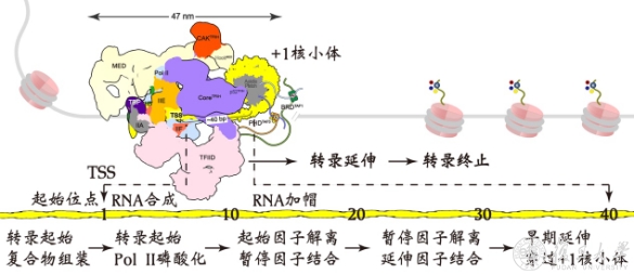 +1核小体在转录起始到转录早期延伸系列动过过程中都可能发挥作用。从转录起始位点到+1核小体为40bp左右,约为14纳米,在这个范围内会发生一系列转录早期事件,也是基因表达调控的核心区域。