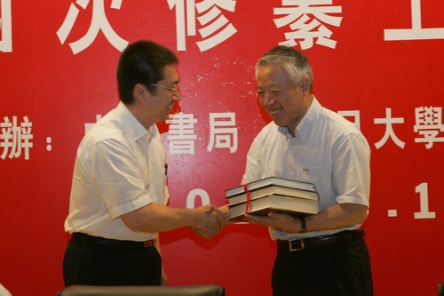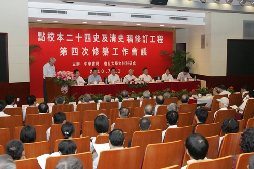 新闻中心讯 2010年7月11-12日,点校本“二十四史”及《清史稿》修订工程第四次修纂工作会议在复旦大学召开。复旦大学党委书记秦绍德教授、修订工程工作委员会主任杨牧之同志、全国高校古籍整理研究工作委员会主任安平秋教授,中宣部出版局、新闻出版总署出版管理司、中国出版集团等有关单位领导,以及部分曾经参与“二十四史”及《清史稿》点校工作的上海学者、复旦大学知名学者、上海出版界领导等出席大会。中华书局向复旦大学赠送《清代蒙藏回部典汇》等大型图书。