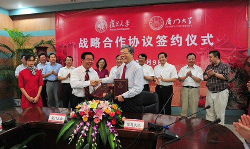 新闻中心讯 9月9日,我校与厦门大学战略合作协议签约仪式在厦门大学举行。校长杨玉良和厦门大学校长朱崇实在协议上签字。校党委书记朱之文出席签约仪式,仪式由厦门大学党委书记杨振斌主持。