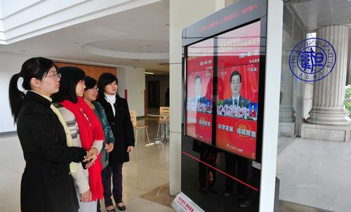 在寝室楼里、教学楼边、学生广场两侧,多块人民日报多媒体电子显示屏从8:30起就转播了人民大会堂十八大开幕的实况。许多学生在课间或路过时,都停留驻足,围观盛会实况,收看总书记的重要讲话。