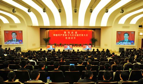 上午8:30,全校近2000名师生,来到分布于位于四个校区的报告厅、会议室,集体收看党的十八大直播。在复旦大学光华楼吴文政报告厅内,在校的党政领导、已经退休的老党员老同志代表、学者、教师和学生400余人齐聚一堂,共同聆听、学习了胡锦涛总书记作的大会报告。