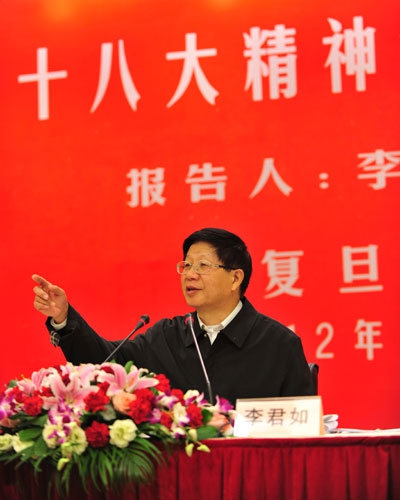 在2个多小时的报告中,李君如教授以坚持和发展中国特色社会主义为主线,以全面建成小康社会奋斗目标为切入点,分五个方面对党的十八大报告进行了系统梳理和全面解读。李君如指出,党的十八大报告提出,当前我们的奋斗目标是全面建成小康社会。要实现这一奋斗目标,必须坚持中国特色社会主义方向,坚定我们的道路自信、理论自信、制度自信,必须“五位一体”推进中国特色社会主义发展,必须坚持以科学发展观为指导,必须提高党的建设科学化水平。