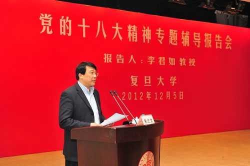 朱之文在主持报告会时表示,认真学习贯彻党的十八大精神,是我校当前和今后一个时期的首要政治任务。校党委已经下发了通知,要求各级党组织把学习十八大精神作为近一段时间党委中心组理论学习的中心内容、党校培训的重点内容、党支部组织生活的主要内容,结合实际开展形式多样的学习活动。各级党员领导干部要带头学习,做到先学一步、学深一步。校党委还将以学习贯彻党的十八大精神为主线,以党员领导干部培训为重点,有计划、有步骤、分专题举办各类培训班、研讨班,努力加深党员干部对十八大精神的理解,努力提高党员干部的能力和素质。