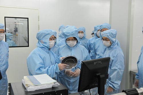 翁铁慧一行首先参观了位于微电子楼的微电子学院净化实验室,在实验室工作人员的帮助下,大家穿上特制的防尘服进入实验室参观。微电子学院院长严晓浪,副院长张卫、闵昊,复旦微电子公司俞军等人陪同参观并介绍了实验室情况。随后,翁铁慧一行来到光华楼西主楼30楼观看了成果展示,听取我校专家汇报并交流座谈。
