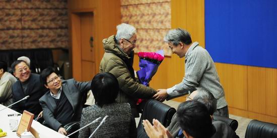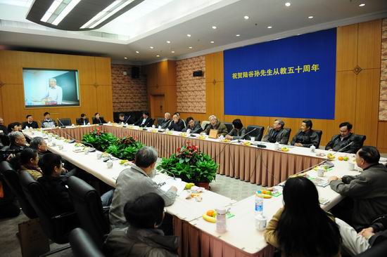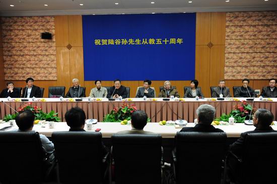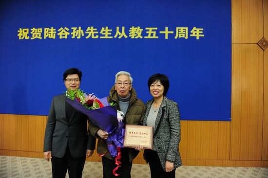 11月18日上午,复旦大学外文学院举行座谈会祝贺陆谷孙教授从教50周年。陆谷孙先生和他的同事、好友、学生50余人参加座谈会。副校长许征、副校长林尚立到会祝贺,并向陆老师颁赠刻有“桃李不言 高山仰止”的纪念牌。座谈会由外文学院院长褚孝泉教授主持。