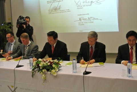 在VUB的签约仪式,左起:Pascal Smet部长、Paul De Knop校长、陈雨露校长(人大)、杨玉良校长(复旦)和谢和平校长(川大)