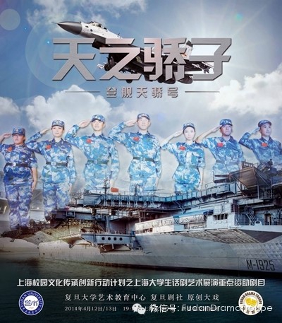4月13日晚上,全国首部由在校师生自编自导自演、反映大学生参军题材的原创话剧《天之骄子》在上海戏剧学院实验剧场首次面向社会公演,本剧由复旦大学校艺术教育中心和校文化建设办公室及复旦剧社联合推出,并入选上海校园文化传承创新行动计划之大学生话剧艺术展演重点资助剧目。复旦大学党委副书记尹冬梅,上海市教卫工作党委宣传处、教育电视台、市教委体卫艺科处的相关领导以及上海戏剧学院的专业教授和该剧主创单位负责人莅临现场进行指导,百余名社会各界观众现场观看了时长一个半小时的演出。