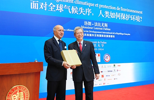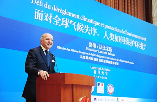 新闻中心讯 5月17日上午,正在访华的法兰西共和国外交和国际发展部长洛朗·法比尤斯(Laurent Fabius)登上复旦大学法国研究中心主办的“复旦法兰西论坛”,并向近300位中国师生发表了题为“面对气候失序,人类如何保护环境”的演讲。