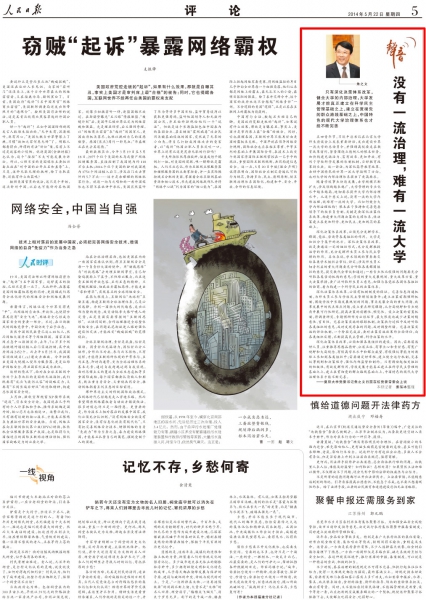 五四青年节,习近平总书记在北京大学师生座谈会上发表重要讲话,发出建设世界一流大学的总动员令,并强调高校要走在教育改革前列,紧紧围绕立德树人的根本任务,加快构建充满活力、富有效率、更加开放、有利于学校科学发展的体制机制,当好教育改革排头兵。这一讲话,为深化高等教育改革、办好中国特色的世界一流大学指明了方向,也对大学的内部治理体系提出了更高要求。