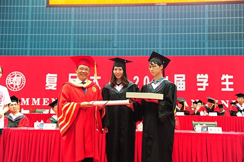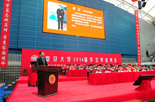 当天,按照复旦的传统,在主席台第一排就坐的依然是部分来自文、理、医各个学科的知名学者、院士、教学名师代表。主席台两侧,高悬着这样一幅对联:“绚丽青春,博学笃志践真理,常系国家;闪亮人生,切问近思求真善,惟将努力”。毕业典礼由常务副校长陈晓漫主持。