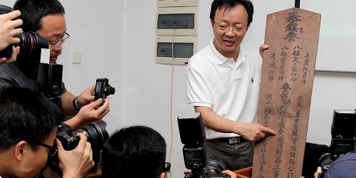在当天发布会上,尤为引人注目的还有一块书有“奉镇祭”的木牌。当时,日军占领复旦大学后,在复旦校区附近驻扎许多兵营,建造许多军官宿舍,并为部队新建相关设施,该木牌系日军某部队后勤官在复旦校区附近新建澡堂时举行祭祀仪式的奠基牌,它无疑也成为记录日寇侵占复旦大学的有力罪证。