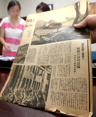 卢沟桥事变后,1937年8月13日,日军便以租界和停泊在黄浦江中的日舰为基地,对上海发动了大规模进攻,并于10月24日早晨占领复旦大学。 在本次发布会上,复旦大学档案馆向媒体展示了该馆征集到反映这段历史的两份日本《支那事变画报》,该画报以大量篇幅鼓吹“占领复旦大学立下特殊功勋的谷川部队”,该报道称“复旦大学是全中国屈指可数的大学,以校舍规模庞大,设施完备而著称”,“因此,谷川部队连日猛攻复旦大学,果断决定突击,十月二十四日攻陷复旦大学”,该报道附有大量照片,包括“包围校园,向校内突击的谷川部队”、“在大学正门前,谷川部队、青海川部队三呼万岁”等,均为日军侵华的罪行提供了不可辩驳的铁证。