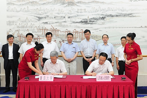 新闻中心讯 7月25日,我校与山东省政府在济南签署战略合作协议,与济宁市高新区签署合作备忘录。校长杨玉良与山东省委常委、常务副省长孙伟在战略合作协议书上签字,并为山东复旦研究院、山东复旦高端人才培训基地、复旦大学科研成果山东孵化基地揭牌。副校长金力与济宁市高新区党工委书记佘春明签署合作备忘录。山东省人民政府副秘书长高旭光、校党委副书记刘承功参加签约并出席座谈会。