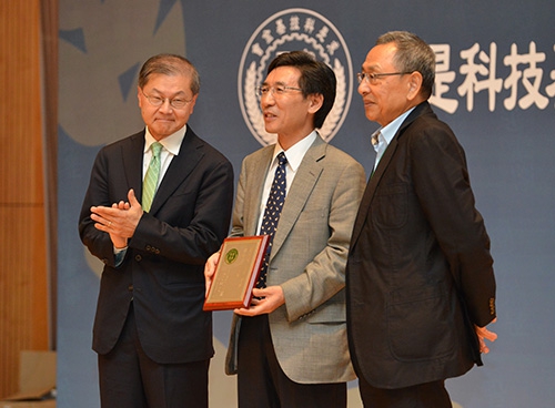 新闻中心讯 2014年9月13日,香港求是科技基金会主办、复旦大学承办的“2014求是奖颁奖典礼”在复旦大学美国研究中心谢希德演讲厅举行。本届颁奖典礼颁发出一位“求是杰出科学家奖”和十位“求是杰出青年学者奖”。求是基金会主席查懋声以及顾问何大一、孙家栋、施一公、韩启德参加了颁奖典礼,并为获奖人颁奖。复旦大学党委书记朱之文在颁奖典礼上致辞。