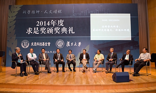 颁奖典礼后半场的Panel Discussion由复旦大学校长、两度求是奖得主杨玉良教授主持,主题为“为科学而科学:基础研究的意义,价值和环境”。由曹雪涛、何大一、蒲慕明、饶毅、施一公、王晓东、薛其坤、杨学明、张泽等9位著名科学家参与,现场探讨当下我国应该从哪些方面着手创造条件,鼓励自由探索、原始创新,从而促进基础科学研究的良性发展。