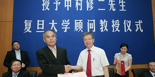 早在2009年,我校就聘任当时在加利福尼亚大学工作的中村修二为顾问教授。校长杨玉良亲自向中村教授颁发聘书并表示,中村修二教授受聘为复旦大学顾问教授以后,将会进一步促进我校半导体照明的研究,推动光源与照明相关学科的发展。科技部副部长曹建林也对中村修二加盟复旦寄予殷切的希望,希望“第四代光源能够在复旦诞生”。作为近年来引领国际半导体发光领域的先行者之一,中村修二教授一直十分关注中国发光与照明的教育与研究。近年来,他多次与我国相关研究领域的专家学者进行合作探索。2007年5月,作为第十一届国际电光源科技研讨会主讲人,他专程来我校做报告,引起了很大反响。 2010年10月,复旦大学主办了国际信息学院院长论坛,中村修二也受邀出席会议,针对如同复旦大学这样的综合性学校如何发展信息学院提出了建议。