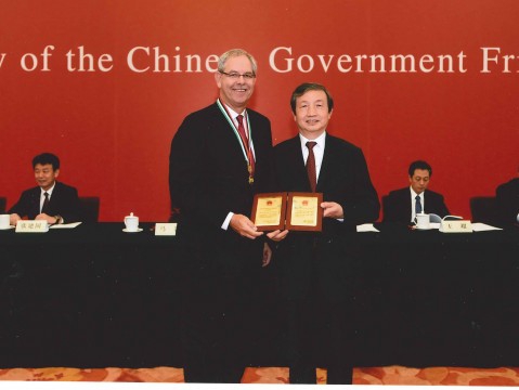 经外事处推荐,我校美国籍顾问教授Scott Laurence Friedman成功荣膺2014年中国政府友谊奖。 9月30日下午,Scott Laurence Friedman 教授在人民大会堂受到了国务院总理李克强的会见并应其邀请出席了当晚庆祝中华人民共和国成立65周年招待会。此前一天,“友谊奖”颁奖大会在北京人民大会堂隆重举行,国务院副总理马凯向包括Friedman 教授在内的获奖者颁奖并讲话。