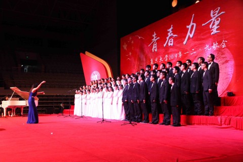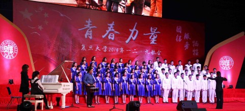 在院系精彩献唱的同时,团学干部校友合唱团和校合唱团也为我们带来了精彩的曲目。团学干部校友合唱团是由曾经在复旦工作过的团干部组成的。他们的歌声尽管不再清脆,但对复旦的爱却更加深沉。他们演唱的《在太行山上》和《让世界充满爱》感染了在场所有的师生,歌声久久回荡在正大上空。校合唱队则用专业和热情的表演征服了全场观众。