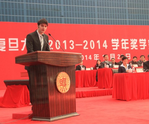 田博毅同学本年荣获国家奖学金和复旦大学本(专)科生艺术单项奖学金。作为复旦剧社的主要成员,保持优异学习成绩的同时,于2014年参与创作并主演话剧《天之骄子》荣获“中国戏剧奖•校园戏剧优秀剧目奖”,本人获“校园戏剧之星”称号。他在发言中表示复旦的通识教育和学术氛围使自己不仅打破了学科视野的壁垒,更帮助其全方位提升了能力,并表达了自己“倾其一生,尽我所能,全心全意为人民服务”的远大理想。他呼吁同学们,努力学习,践行理想,回馈社会,追求卓越。