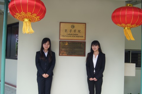 我校国际文化交流学院2013级汉语国际教育硕士专业研究生俞竹、方岚2014年在斐济南太平洋孔子学院任汉语教师志愿者,期间在我驻斐济使馆领导下,积极参加习近平主席访问团接待工作,出色完成各项任务,展现出复旦学子的良好风貌,受到孔子学院总部、国家汉办表扬。