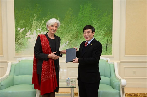 论坛开始前,复旦大学校长许宁生接见了拉加德女士一行,就共同关心的问题进行了亲切友好的交谈。随后,双方成员互赠了礼物并合影留念。