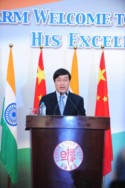 在甘地和印度研究中心揭牌仪式上,主持人冯晓源副校长介绍了该中心的负责人和研究人员,两名复旦学生用梵文朗诵印度史诗《摩诃婆罗多》。随后,许宁生校长在致辞中对莫迪总统一行到访表示热烈欢迎。他指出,复旦大学在中印两国人文交流中起到了积极促进作用,复旦有关印度的研究与合作可以追溯到上个世纪,而目前正在进行的丝绸之路、西域、玄奘取经之路等的综合研究与印度密切相关。许宁生表示,学校将整合资源,与ICCR等机构、高校密切合作,力争把中心建设成国内研究印度历史、社会、经济、文化和甘地思想的重要基地和交流平台,期望通过学术科研活动,推进两国相互了解共同合作。