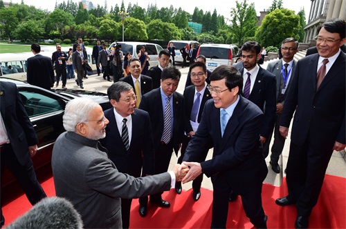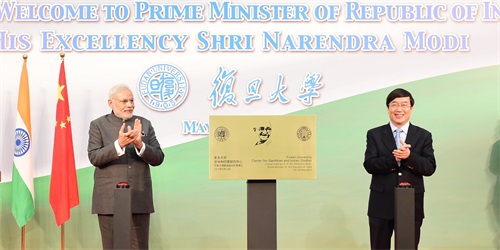新闻中心讯 5月16日下午,印度总理纳伦德拉·莫迪(Narendra Modi)到访我校,出席甘地和印度研究中心揭牌仪式。中国人力资源和社会保障部部长尹蔚民、中国驻印度大使乐玉成、印度驻华大使康特陪同访问。上海市市长杨雄、复旦大学党委书记朱之文、校长许宁生在光华楼金厅会见了莫迪一行。会晤结束后,莫迪总理一行来到光华楼志和堂,和许宁生校长一道为甘地和印度研究中心揭牌。随后莫迪总理发表了演讲。