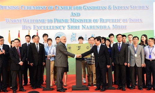 随后,莫迪总理和许宁生校长一道为甘地和印度研究中心揭牌,并与研究中心首届主任、文史研究院研究员刘震等研究中心的老师和同学合影留念。今后,研究中心主要从事与印度相关的文史哲研究,以及印度当代政治经济类研究,将开展对印度语言、宗教、文化、佛学和中印文化史的研究,对当代印度政治和经济的研究,对甘地思想及其影响的研究等方面的学术研究。研究中心将组织召开印度学研究年度会议,组织印度学领域的访问学者项目,推动印度语言和文化的教学,建立向全校开放的印度学资料室。