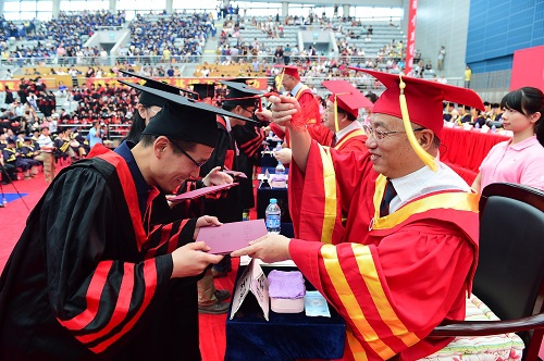 在庄严而神圣的学位授予仪式环节,博士毕业生在全体与会师生和家长的见证下依次从颁证主席手中接过学位证,接受拨穗,为自己过去几年的研究生学习画上了圆满的句号。最后,毕业典礼在全场师生深情的校歌声中落下了帷幕。