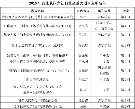 近日,国家哲学社会科学规划办公布2015年国家社科基金重大项目(第二批)立项名单,我校9个项目获批准立项,立项数位列全国第一。据统计,在目前已经公布的两份国家社科基金重大项目立项名单中,我校共有11个项目立项,立项总数位列全国第一。这是我校继2011、2012年之后,第3次获得国家社科基金重大项目立项数全国第一。