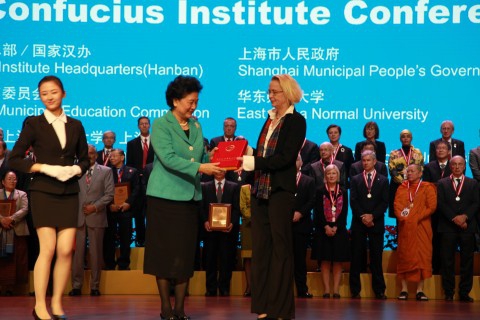 图三: 刘延东副总理向爱丁堡大学苏格兰孔子学院外方院长Prof. Natascha Gentz颁发“示范孔子学院”证书