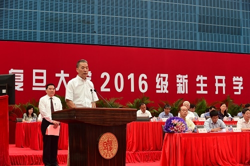 校长许宁生在讲话中代表全校师生员工向全体研究生新生的到来表示热烈欢迎。他以颜福庆、谷超豪、陆谷孙等老一辈优秀复旦人的事迹为例,强调复旦研究生要以承担创新创造为首要责任、以文化传承为历史重任、以服务社会为己任,自觉将复旦精神和校训贯彻、融入到为学为人之中,将个人研究和国家需要结合起来,志存高远、勇于担当、锐意进取、勤奋钻研,书写无愧于时代和人民的人生篇章。