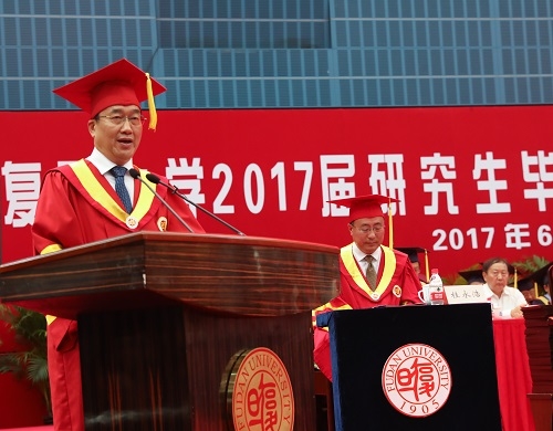 6月23日下午,复旦大学2017届研究生毕业典礼暨学位授予仪式在正大体育馆隆重举行。校党委书记焦扬、校长许宁生等学校党政领导,校学位委员会委员,研究生导师代表,各院系党政领导,2017届全体毕业研究生以及毕业生家属出席典礼。毕业典礼由常务副校长桂永浩主持。