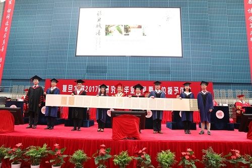 2017届全体毕业研究生向母校送上了纪念品——全长5.27米的《复旦笺谱》,以此纪念母校校庆日。校党委书记焦扬代表学校接受礼物。作品分为“花木关情”和“先贤遗墨”两个篇章,选取了四个校区代表性的花木及复旦先贤手迹共计十二品,凝结了复旦毕业生心中最美好的母校形象。同时,信笺寓意思念,也承载着毕业生对母校永不割舍的情意和在母校精神的感召下不断进取、捷报频传的决心。