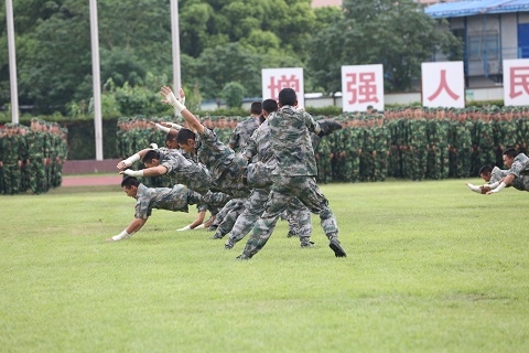 分列式表演后,由军训团参训学生代表进行了军体拳表演。他们气势昂扬,精神饱满,动作整齐划一,口号响彻全场,赢得现场掌声阵阵。随后,军训团全体教官进行擒敌拳表演,教官们拳下生风,动作刚劲有力,口号声震撼全场,一套擒敌拳打得虎虎生风,一招一式尽显军人气魄,现场的同学们惊呼连连,掌声不断。