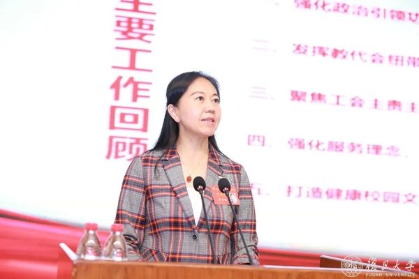 尹冬梅指出,在广大教职工及其代表、工会干部的共同努力下,学校教代会、工会工作稳中求进,行稳致远。2021年校工会以习近平新时代中国特色社会主义思想为指导,持续深化“三全育人”综合改革试点任务对工会提出的新要求、新责任、新使命,在建机制、强功能、增实效上下功夫,构建联系广泛、服务教职工的群团工作体系,推动工作创新发展,不断增强教职工的获得感与幸福感,为学校建设“第一个复旦”和全面开启迈向中国特色世界顶尖大学新征程作出新贡献。会上,她回顾了2021年主要工作,汇报了2021年工会财务管理工作,强调2022年要以二十大精神和习近平新时代中国特色社会主义思想为指引,重点强化政治引领、加强民主管理、竭诚服务教职工、广泛开展群众性文化活动等工作。