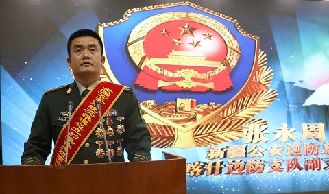 新疆维吾尔自治区喀什边防支队副支队长张永周的报告题目《倒下,也要向着前方》正是他信念的写照。他向师生们讲述了在反恐斗争的前沿一次次惊心动魄的对敌战斗,彰显了不畏牺牲的英勇气概。