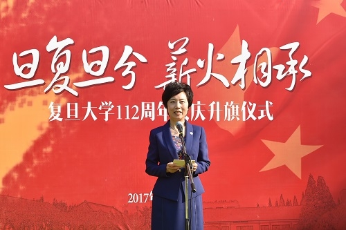 今天,我们相聚在此,举行复旦大学建校112周年升旗仪式,以这种特殊而有意义的方式纪念复旦大学建校112周年,庆祝母校的生日。1905年,为抵制帝国主义文化侵略,为中华民族培养栋梁之才,以马相伯为首的一批爱国师生、仁人志士在《时报》上登载公告,宣布创办复旦公学,从此“复旦”校名第一次为社会所知,开启了复旦“巩固学校维护国家”的历程。1949年5月27日,上海解放。为纪念这个复旦赢得新生的日子,经陈望道老校长提议,1950年5月8日校务委员会通过决议,决定每年的5月27日为校庆日。从此,“5.27”成为复旦人心中一个特殊的日子,这是属于复旦的日子,这是我们每一位复旦人的节日。在此,我代表学校,向全校师生员工,向广大海内外校友致以亲切的祝福与问候!让我们共同祝愿我们的母校——复旦大学生日快乐!