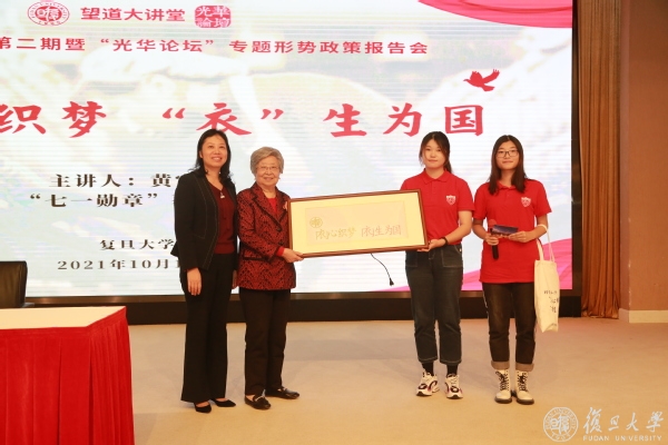 10月19日下午,“七一勋章”获得者、全国劳动模范黄宝妹走进复旦大学“望道大讲堂”,分享她以“全国人民穿好衣”为理想,“衣”心织梦、“衣”生为国、坚守岗位、无私奉献的动人故事,为复旦师生带来一次生动的党史学习教育。