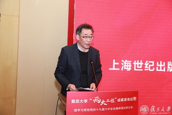 12月19日下午,“两大工程”一期成果20本著作在复旦大学“两大工程”成果发布仪式暨学习贯彻党的十九届六中全会精神理论研讨会上正式揭幕。上海市委常委、宣传部部长周慧琳,复旦大学党委书记焦扬,上海世纪出版集团党委书记、董事长黄强在“两大工程”成果发布会上致辞。复旦大学党委常务副书记裘新主持。