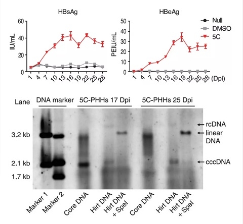 为解决这一问题,合作组以体外培养过程中快速失去功能的人原代肝细胞为研究对象,筛选到5种化学小分子的组合(5 compounds,5C)并利用它们在体外成功实现了肝细胞功能的长期维持。相比于传统遗传学方法,化学小分子能够实现对多个信号通路靶点的精细调控。在长达一个月以上的培养过程中,该培养方法成功抑制了肝细胞的去分化,细胞整体表达谱与体内的肝细胞高度相似,并可长期维持白蛋白分泌、尿素合成、药物代谢等肝细胞的功能。更重要的是,合作组通过一系列实验证明,5C培养的原代肝细胞可支持HBV及HCV,这两种具有严格肝噬性病毒的复制。在长达30天的感染过程中,乙肝表面抗原、e抗原、乙肝病毒DNA等指标明显优于目前常用的培养条件,尤其是能够长期稳定产生乙肝病毒复制必需的cccDNA(共价闭合环状DNA)。在HCV感染方面,5C培养的原代肝细胞中也检测到了丙型肝炎病毒有效复制的信号,而这在普通原代肝细胞培养条件下是检测不到的。肝炎病毒的体外复制模型由于缺乏有效的模拟体内肝脏细胞的模型一直是病毒学领域的难点。基于5C的细胞模型对于进一步开展HBV,HCV及其他肝炎病毒的基础研究及药物研发具有重要意义。