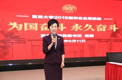 “今年是新中国成立70周年。我预祝并且期待,在新中国100年的时候,大家都能够再回到母校,看看我们经过努力奋斗、迈入世界顶尖大学行列的复旦,壮阔地告诉母校、告诉社会、告诉祖国:为国奋斗,此生无悔!”焦扬站起身来,与毕业生做了一个“约定”,此时,现场响起热烈的掌声。
