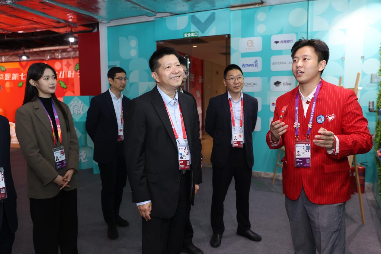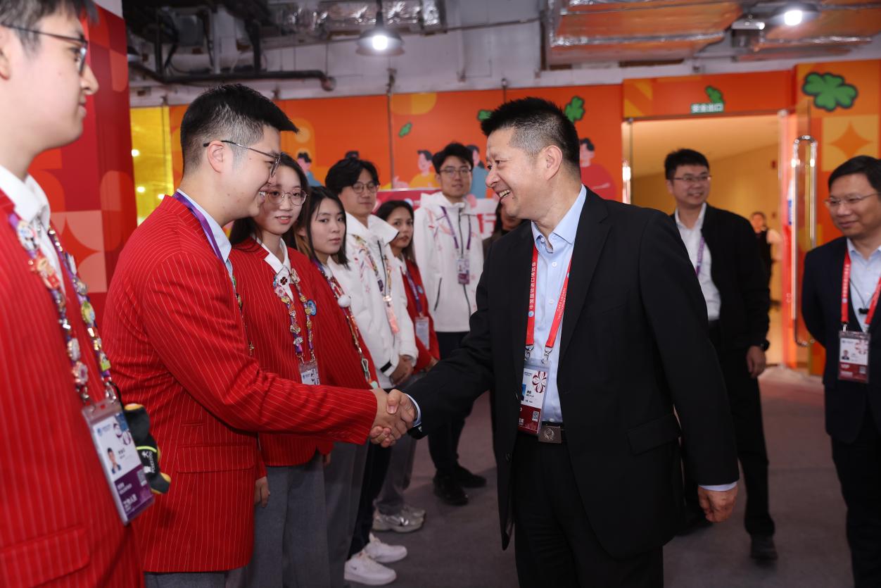 在“小叶子之家”,裘新与志愿者代表交流。他询问了同学们各自岗位的工作内容,对“小叶子”的表现给予肯定,勉励“小叶子”继续努力,以更饱满的精神风貌做好进博会志愿服务工作,在实践中展现复旦青年的风采与担当。