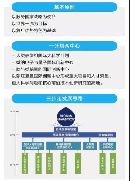 2020年前,培植、孵化、壮大信息技术与生命和健康,及其交叉领域(脑与类脑智能),为张江综合性国家科学中心提供高水平内涵,为张江实验室输送脑与类脑智能等主力板块,促成第一期建设启动,建设一批新型科技机构;基本完成张江复旦国际创新中心基本建设和基础架构;实现离子重离子试验线等第二批复旦项目成为上海和国家级重大项目。