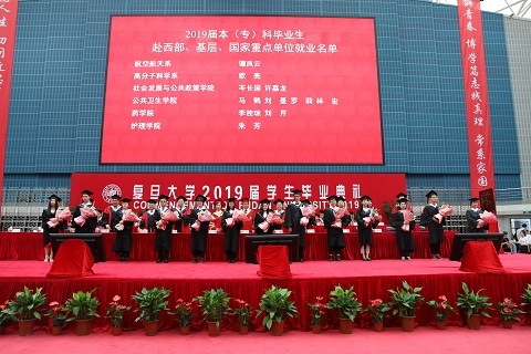 近年来,越来越多的复旦学子选择投身广袤的祖国大地,去往西部、扎根基层、前往国家重点单位砥砺奋斗。同学们秉持“团结、服务、牺牲”的复旦精神,到祖国最需要的地方奉献青春。主席台嘉宾向他们中的优秀代表赠送鲜花,勉励青年胸怀家国志向,铸就时代梦想。