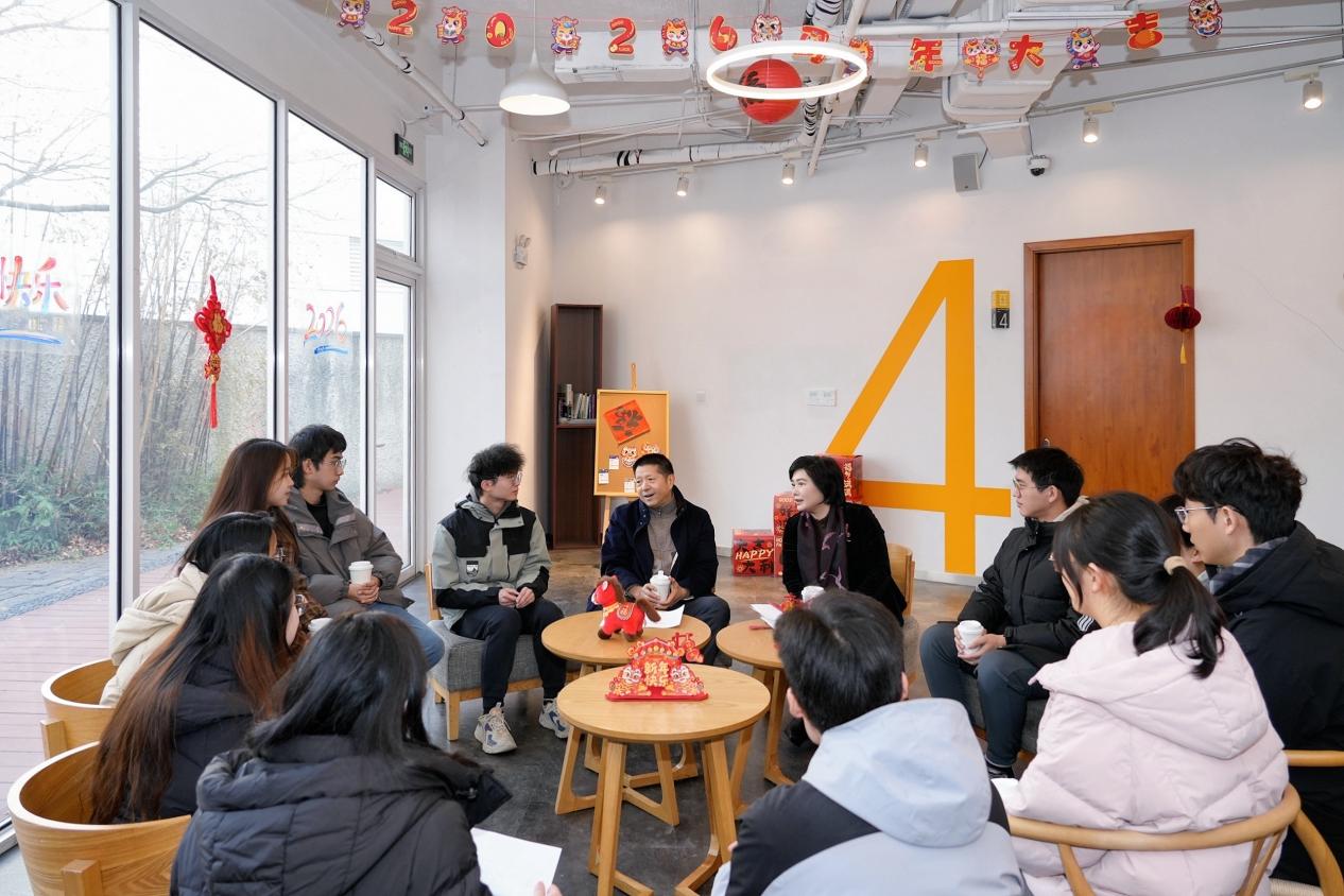 公共空间中,师生们围坐一圈,面对面展开交流。“大家期末考试情况怎么样?考试难度大不大?”裘新询问了同学们的学业情况,并鼓励大家勤奋上进、博学笃志。同学们主动分享了自己的寒假计划和科研进展,并对校园管理、园区服务等提出了积极建议。裘新代表学校向同学们送上新年慰问物资,并祝大家学业进步。