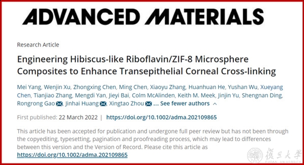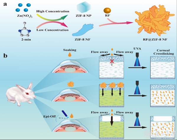 复旦大学附属眼耳鼻喉科医院周行涛、黄锦海团队与温州医科大学附属眼视光医院高蓉蓉团队合作,日前在国际顶尖学术期刊《先进材料》(Advanced Materials,IF 30.8)上发表以MOF为载体装载核黄素的跨上皮角膜交联研究的论文(图1),为圆锥角膜治疗带来新的突破。