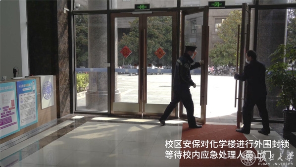 江湾校区对相关楼宇实施一级应急处置响应,楼内物业封闭大楼所有通道,要求所有楼内人员停止流动,校区保安对化学楼进行外围封锁,等待CDC人员上门分别接走阳性和密接人员。