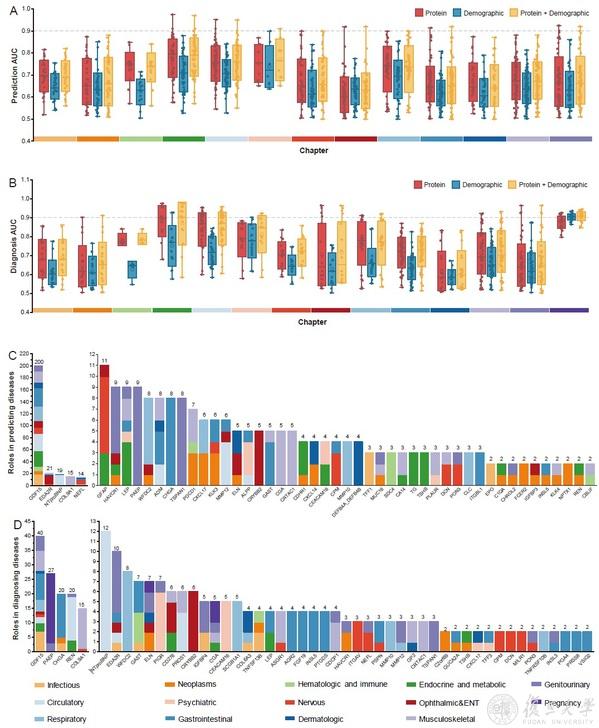 蛋白质在疾病预测和诊断中的性能(A-B.血浆蛋白、人口统计学及综合模型预测[A]和诊断[B]疾病的AUC值;C-D.蛋白质在疾病预测[C]和诊断[D]中的重要度排序)